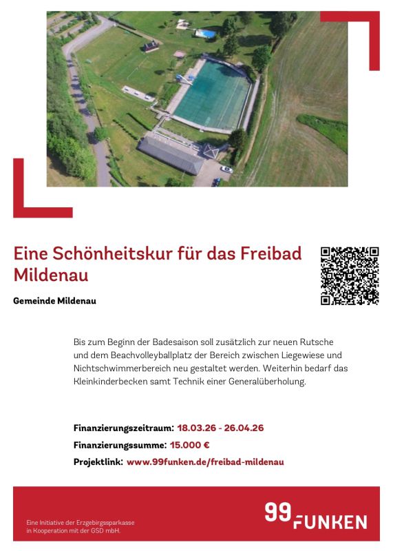 Hierfür packen Kommune und Erzgebirgssparkasse nun gemeinsam mit den Menschen in der Region an: Über die Crowdfundingplattform "99 Funken", einer Initiative der Erzgebirgssparkasse in Kooperation mit der GSD mbH, wurde im Funding-Themenbereich "Sport, Stadt- & Regionalentwickung" zum 18. März 2026 eine entsprechende Aktion gestartet. Im Zeitraum bis 26. April 2026 wird nun dazu aufgerufen, dieses Projekt durch die Gesellschaft zielgerichtet finanziell zu unterstützen, um die angestrebte Bereichsgestaltung sowie das Kleinkinderbecken samt Technik erfolgreich generalüberholen zu können.